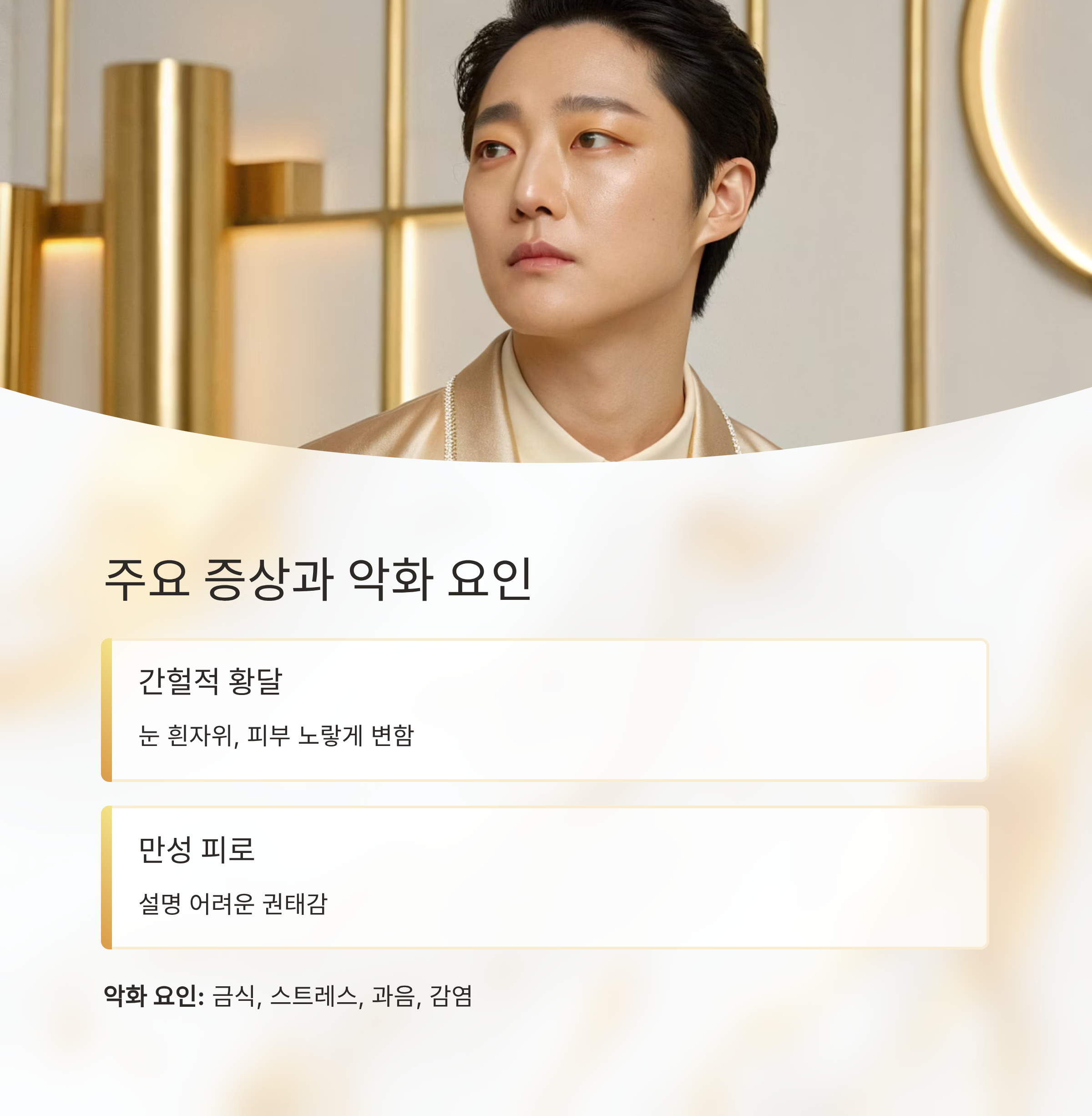 길버트 증후군의 가장 대표적이고 시각적인 증상은 바로 황달입니다. 눈의 흰자위(공막)가 가장 먼저 노랗게 변하는 것을 환자나 주변 사람들이 인지하는 경우가 많습니다. 이 황달은 지속적이지 않고 간헐적으로 나타났다가 사라지는 것이 특징입니다. 대부분 경미한 수준이라 일상생활에 큰 지장을 주지 않지만, 미용상의 문제나 다른 심각한 질환에 대한 염려로 인해 환자가 불안감을 느끼는 주요 원인이 되기도 합니다.